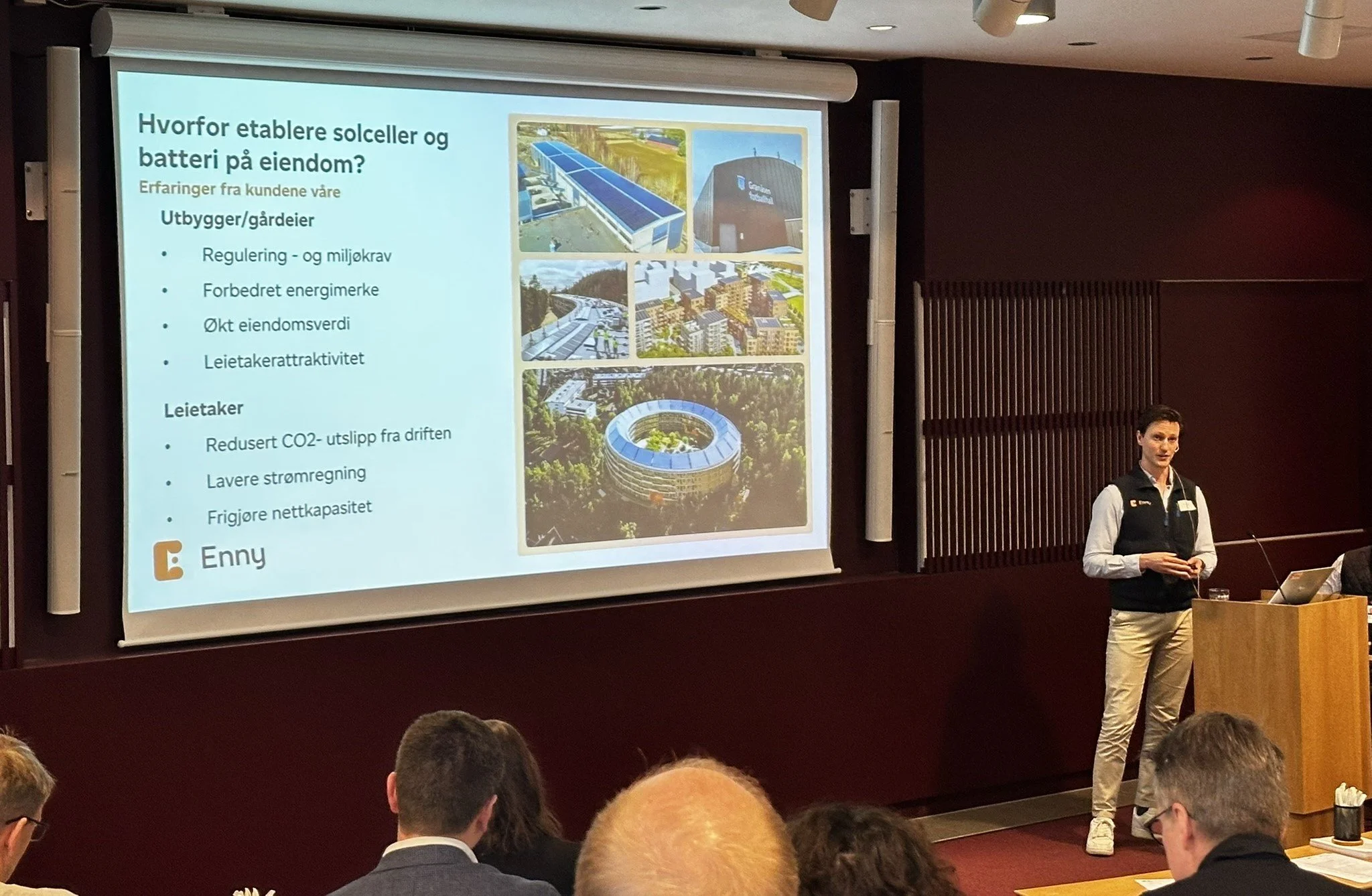 Denne uken deltok Enny med Ludvig Danielson på fagdag om bedre rammevilkår for energideling for næring i Norge, arrangert av Fornybar Utvikling. Dagen samlet aktører fra hele verdikjeden og hadde særlig fokus på delingsordningen – et sentralt virkemiddel for å få mer lokal, fornybar energi i bruk.