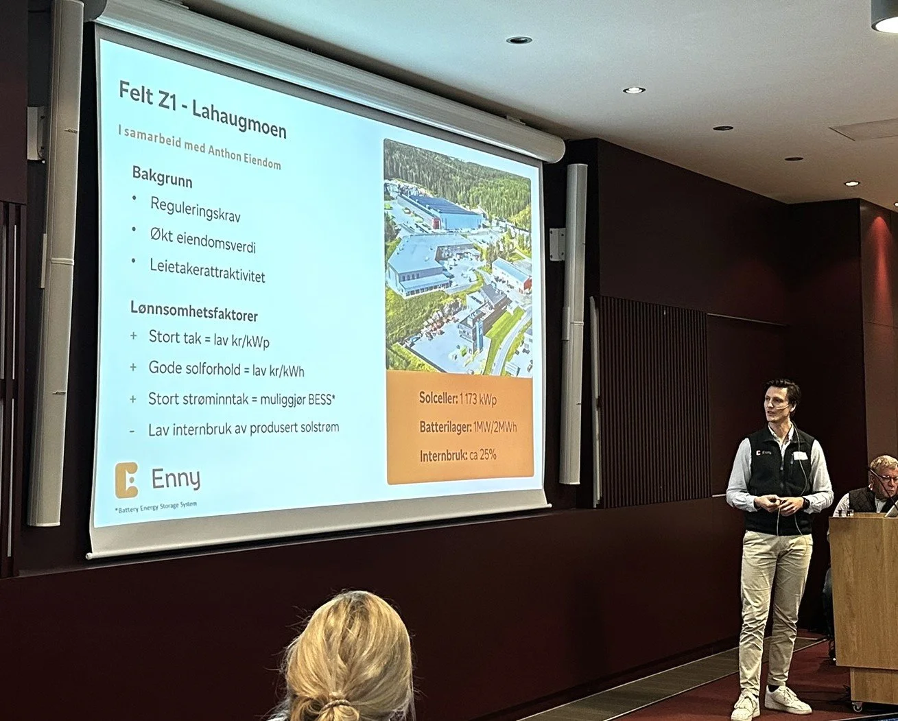 Vår salgsleder Ludvig Danielsson holdt et innlegg om prosjektet på Lahaugmoen, hvor energideling er brukt som en strategisk løsning for eiendomsutviklere, eiere og leietakere. Presentasjonen tok for seg hvordan kombinasjonen av solceller, batterilagring og delingsordningen kan bidra til bedre utnyttelse av lokal energiproduksjon, økt eiendomsverdi og frigjøring av nettkapasitet.